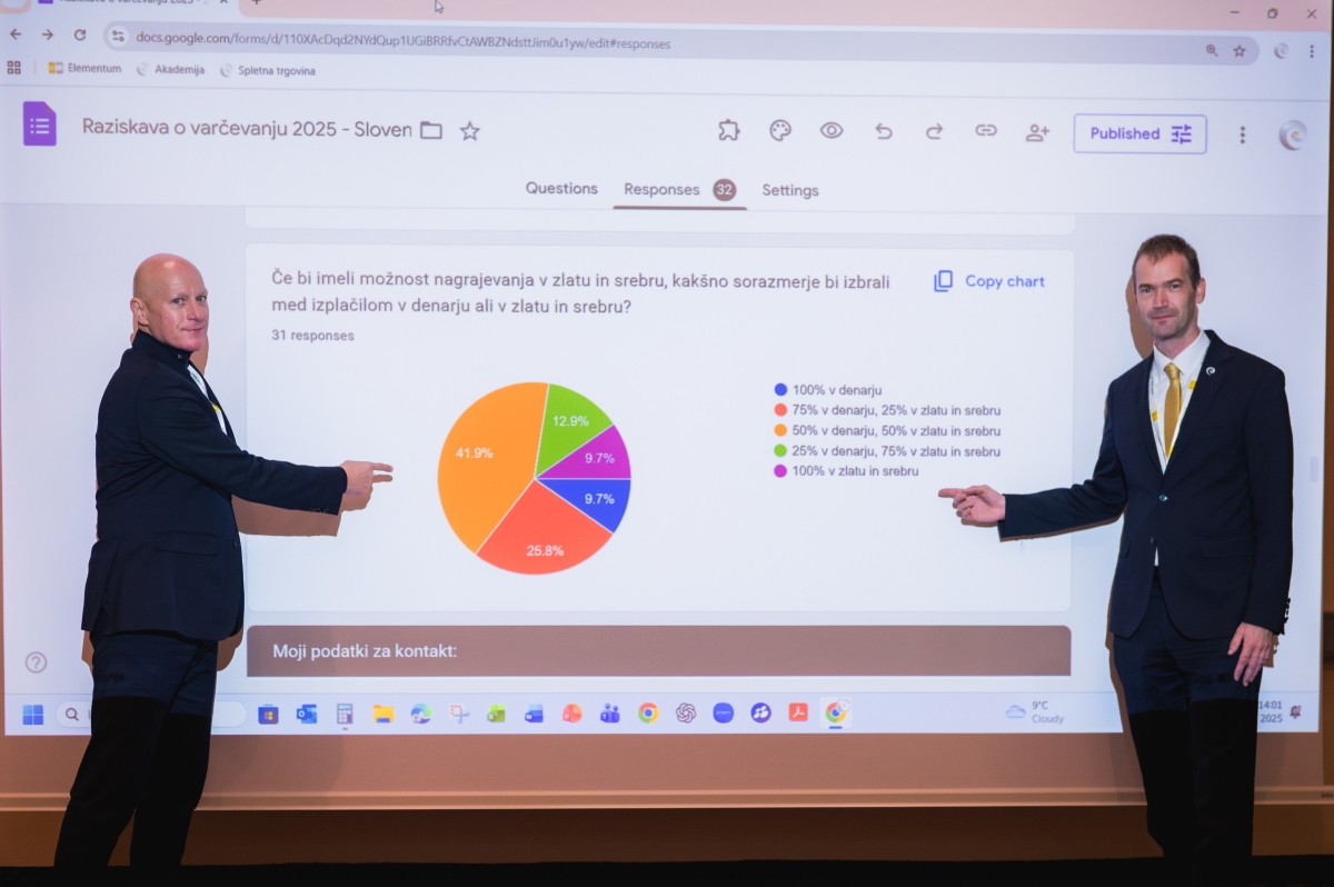 Z veseljem delimo rezultat ankete, izvedene na dogodku: kar 41,9 % udeležencev bi izbralo nagrajevanje v 50 % zlatu in srebru.