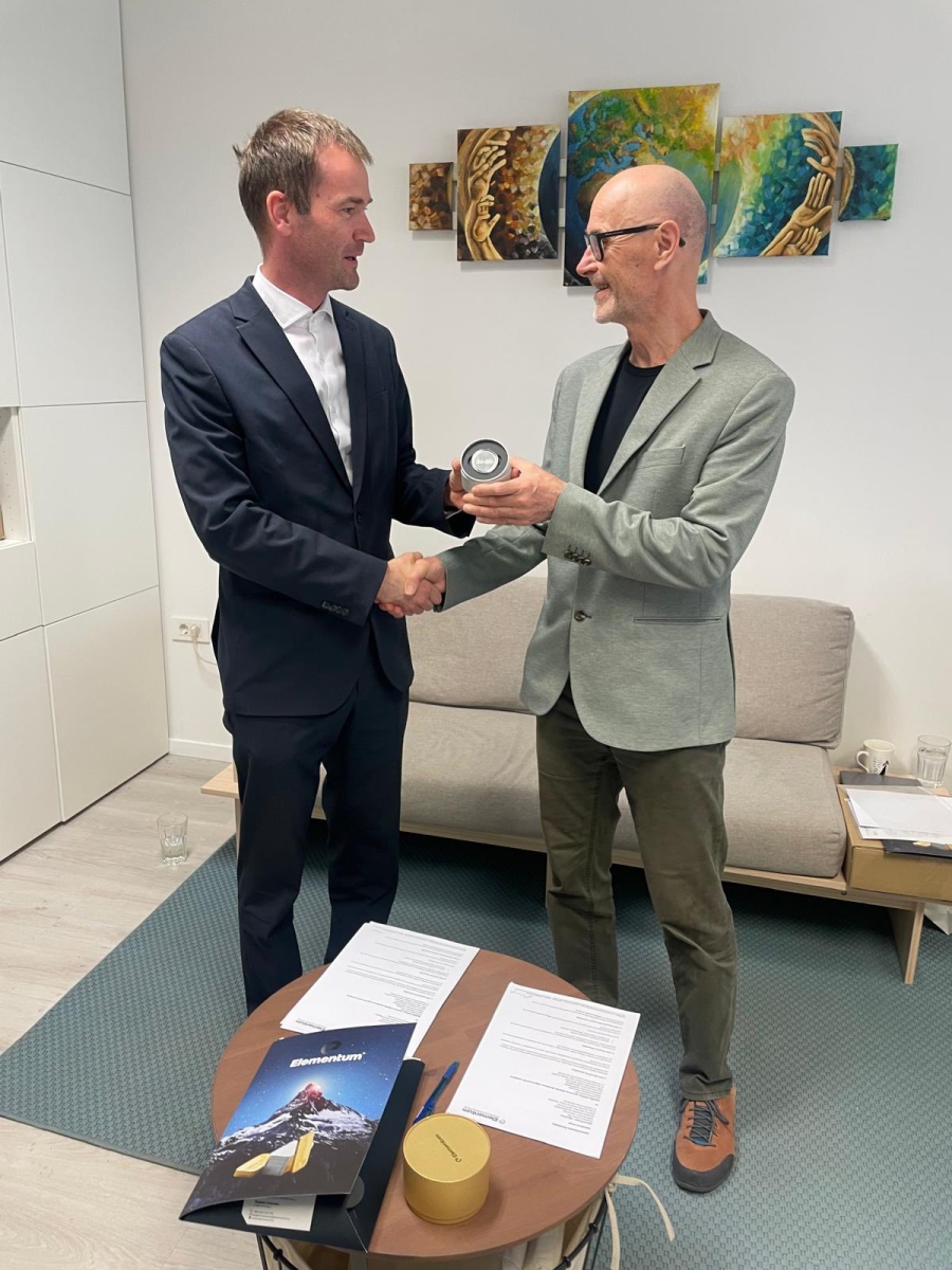 Donacijo sta direktorju Alešu Kranjc Kušlanu v imenu podjetja Elementum predala Peter Slapšak in Bogdan Kukovec.